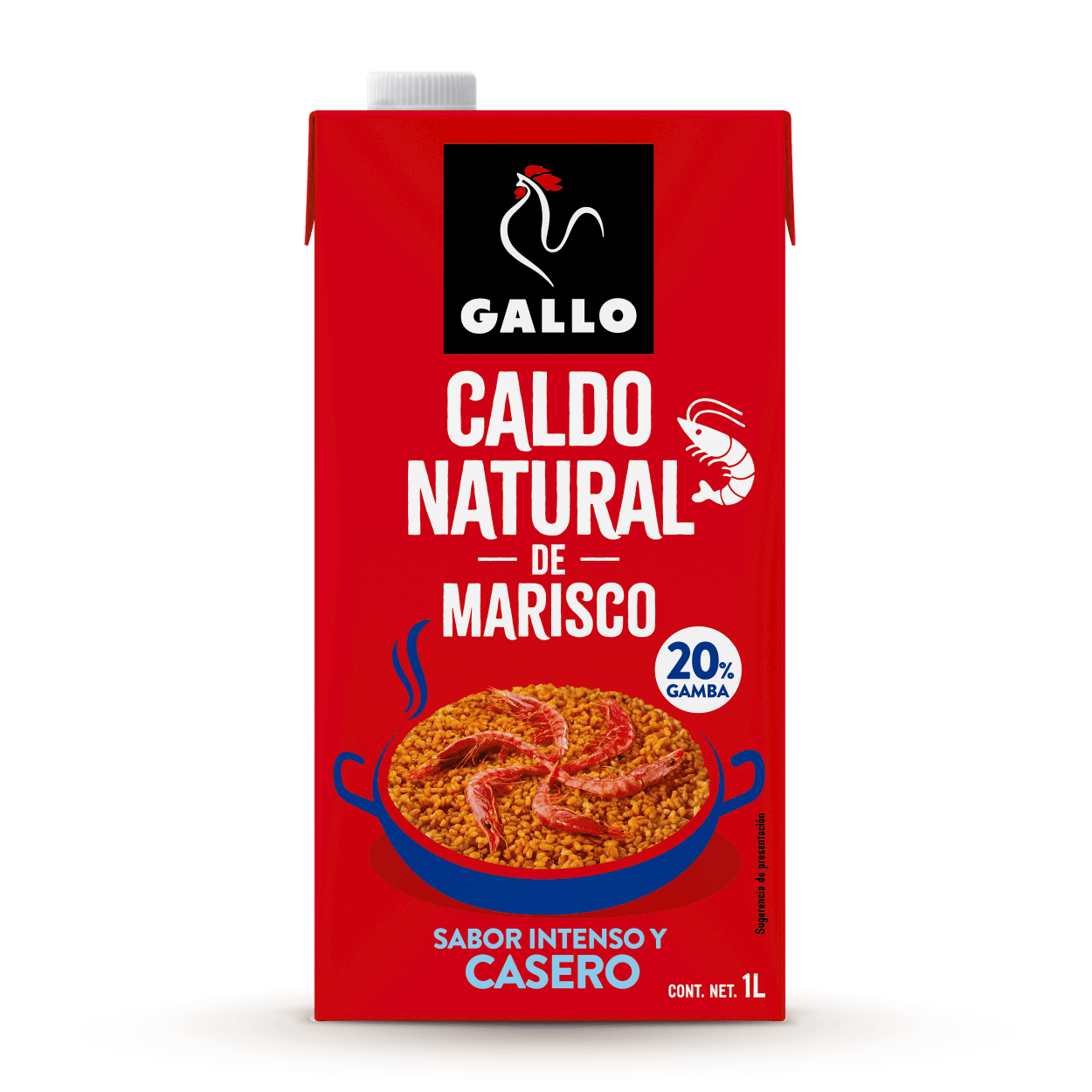 Agua, gamba (crutáceo) 20%, sofrito 5.5% (tomate concentrado, cebolla, aceite de girasol, ajo, ñora), zanahoria, apio, sal, aromas naturales, aceite de oliva virgen extra, especias.