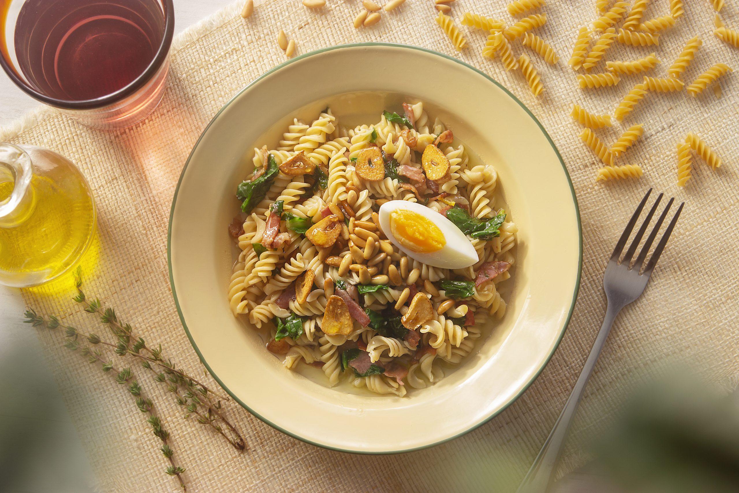 with tomato, spinach, pine nuts and hard-boiled egg