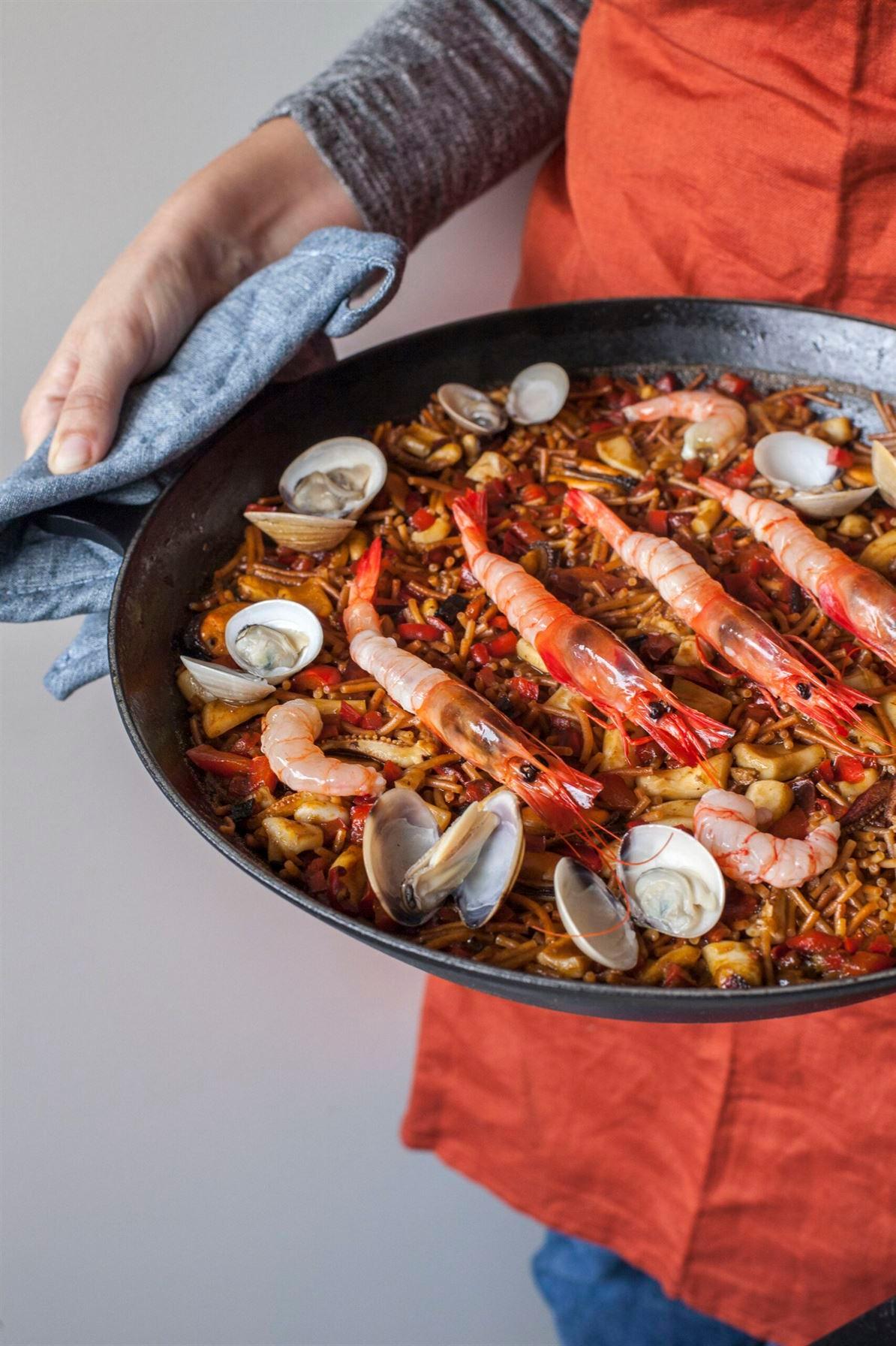 Cuando le queden 3 minutos, añadir las almejas, las gambas y los mejillones. Cuando el fideo esté cocido, dejar reposar 10 minutos, antes de servir.
