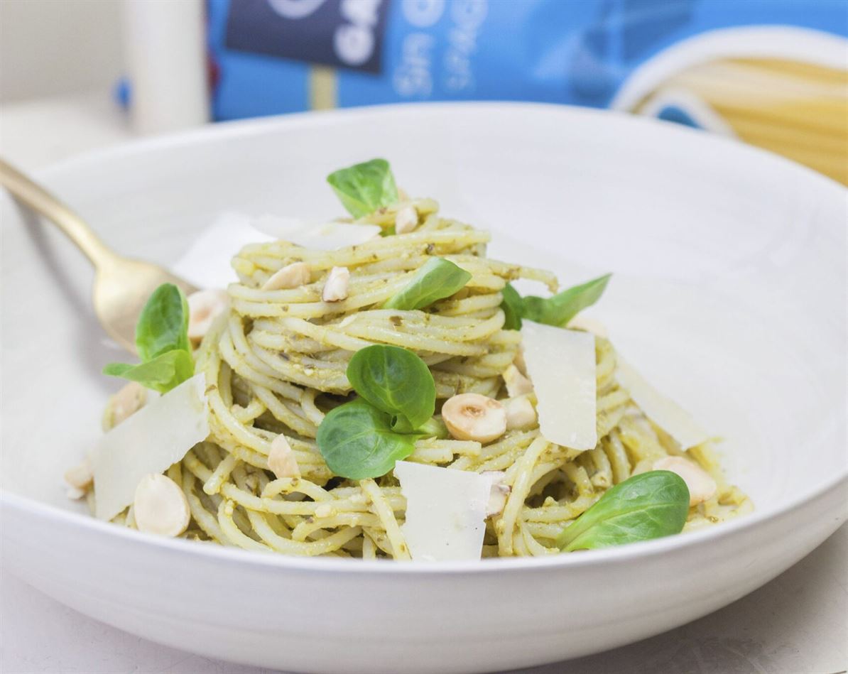 In a bowl mix the spaghetti with the pesto sauce until it is well mixed.
