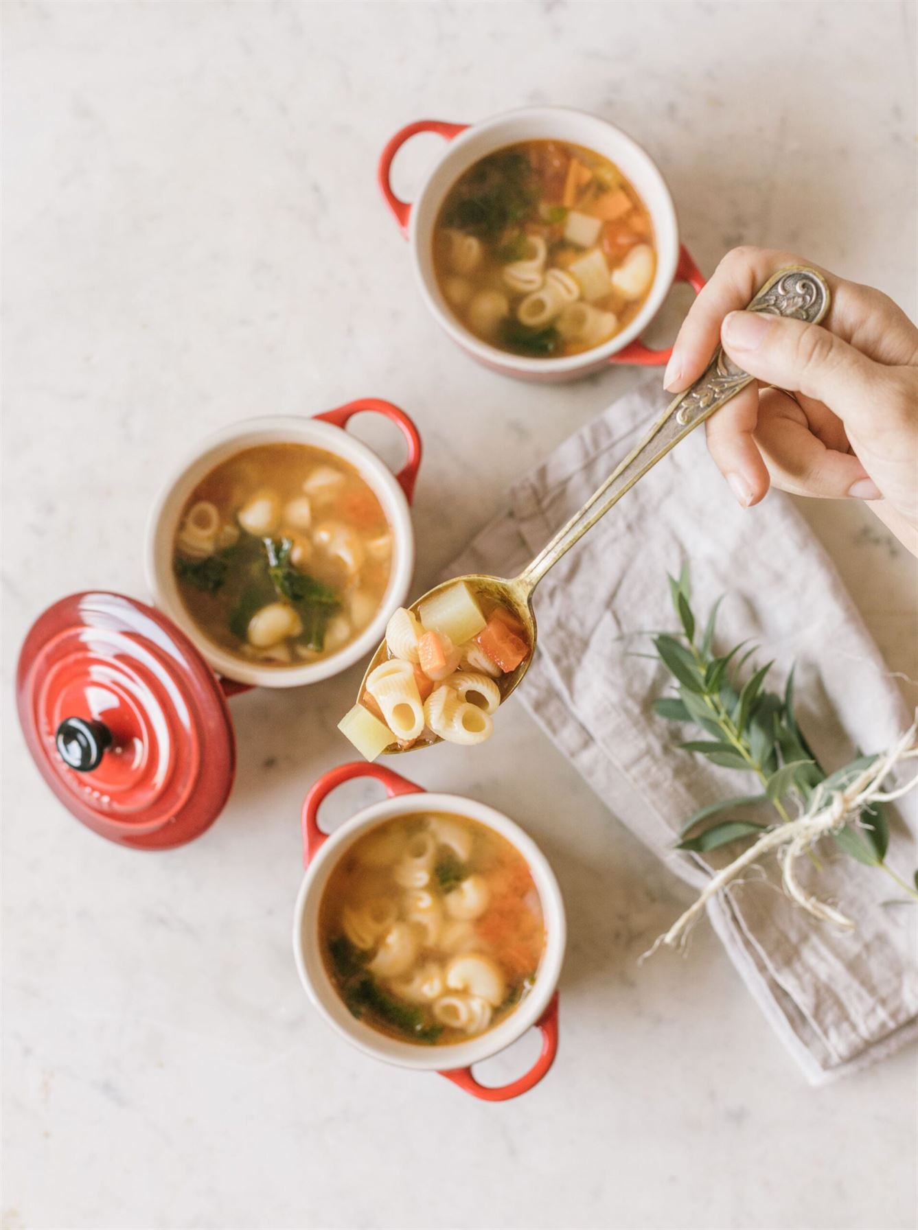 Hacer un caldo cocinando todas las verduras picadas (excepto las alubias) en aceite de oliva unos minutos hasta que estén tiernas.