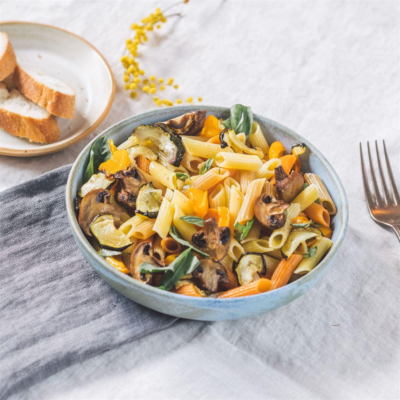 Mix the roasted vegetables with the pasta in a bowl and add the pesto rosso. If necessary, add a little cooking water to thin the sauce.