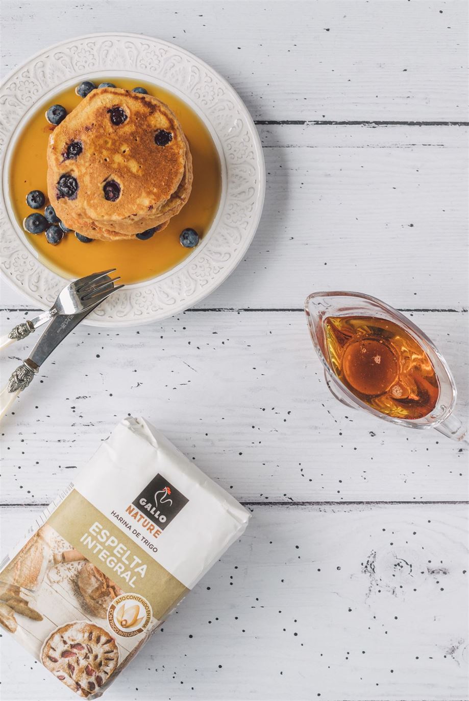 Colocar algunos arándanos encima de la mezcla y cocinar dos o tres minutos de un lado, darle la vuelta y cocinar dos o tres minutos más. Servir con sirope y arándanos frescos.