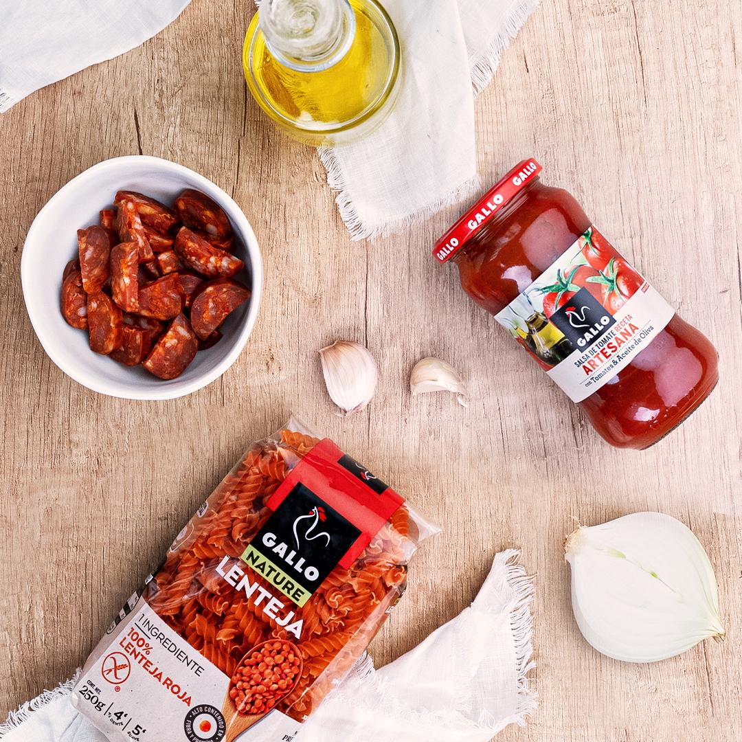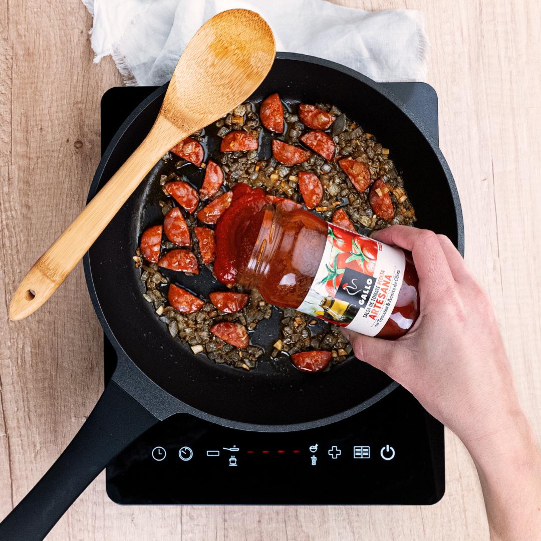En una sartén sofreímos los ajos y la cebolla con un poquito de aceite. Añadimos el chorizo picadito y sofreímos todo. Añadimos la salsa de tomate y removemos bien.