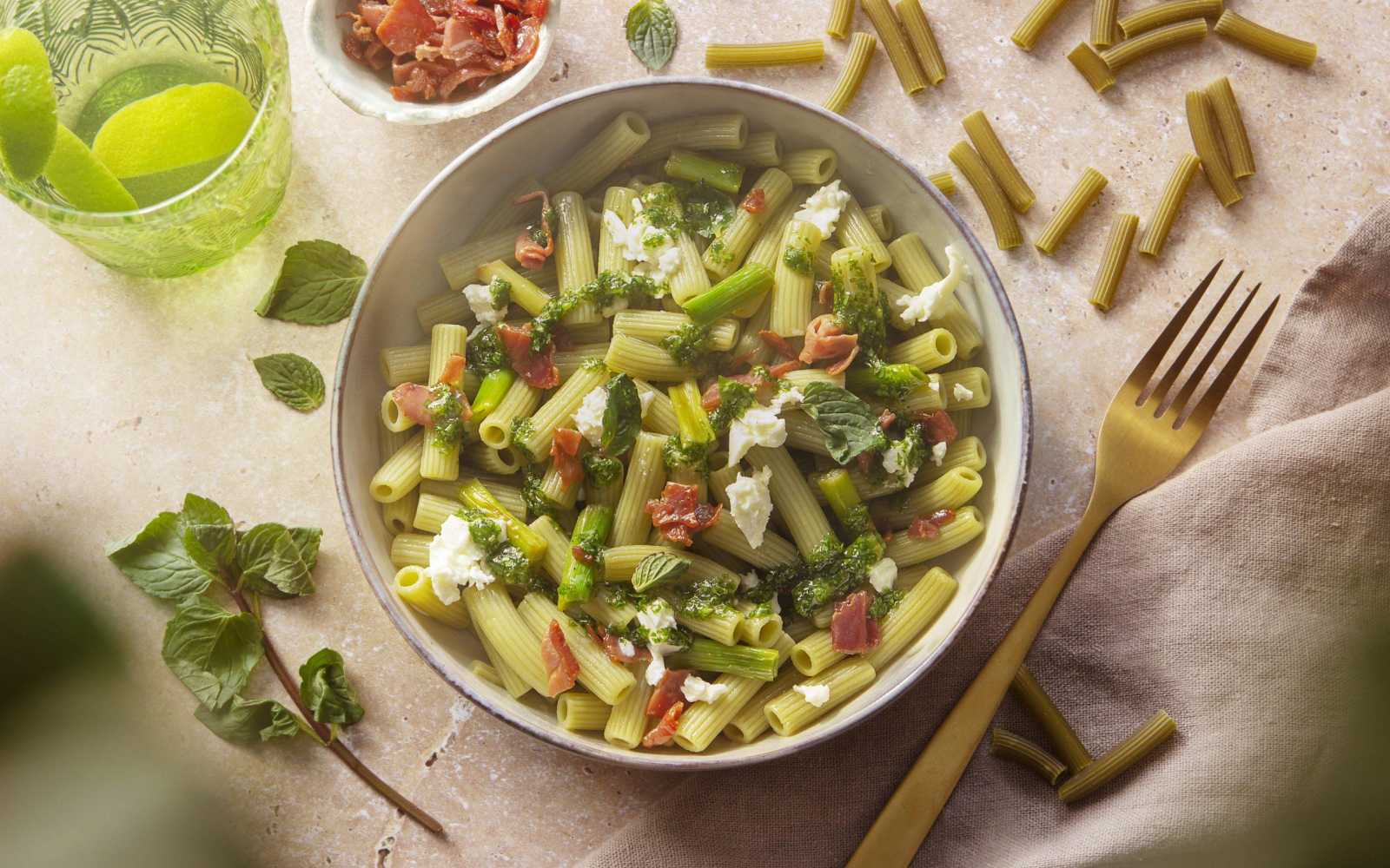 Boil the pasta, strain it and add it to the frying pan with a little fresh chopped mint, mix well.