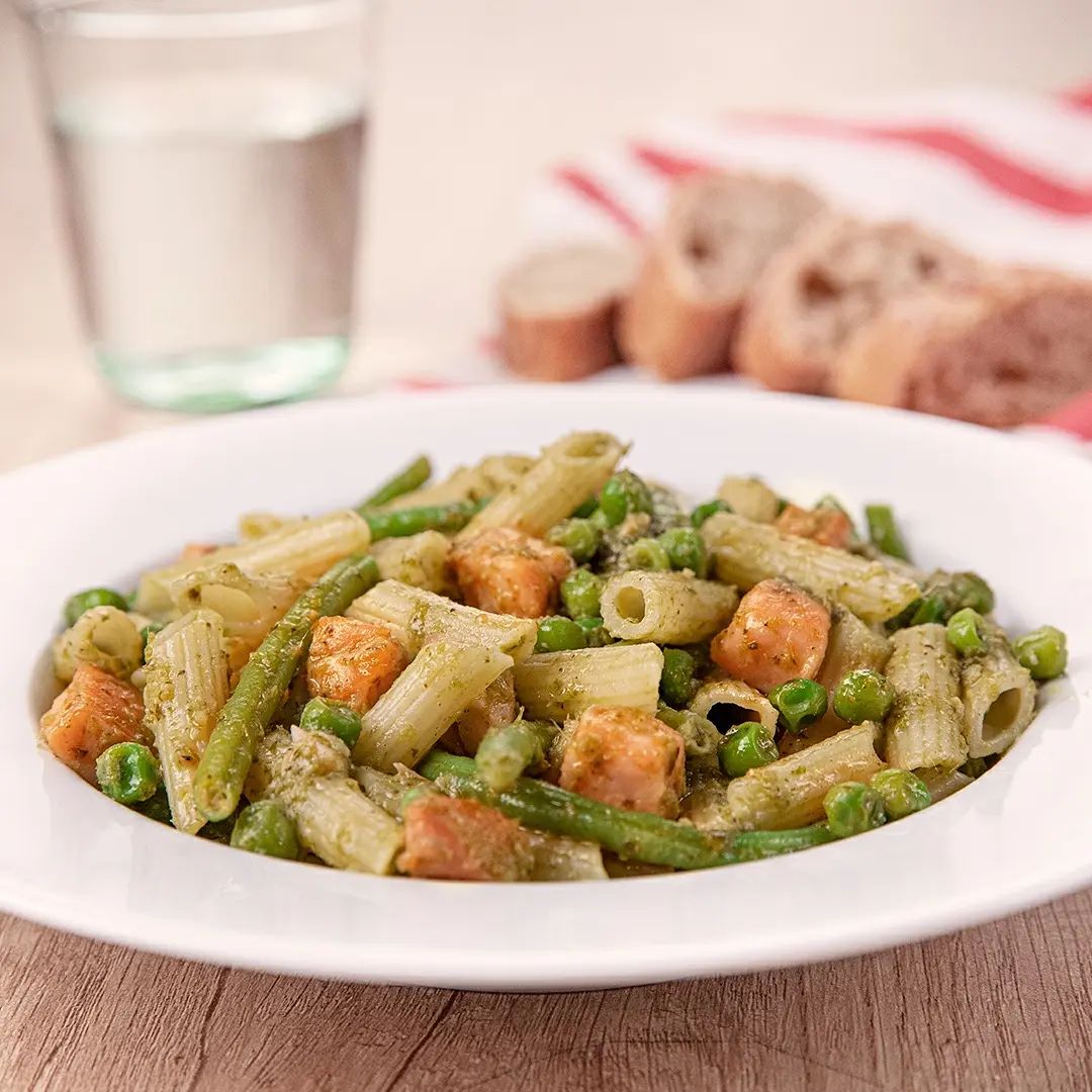 Hervimos la pasta en abundante agua según indicaciones del envase. Escurrimos y aliñamos con aceite.