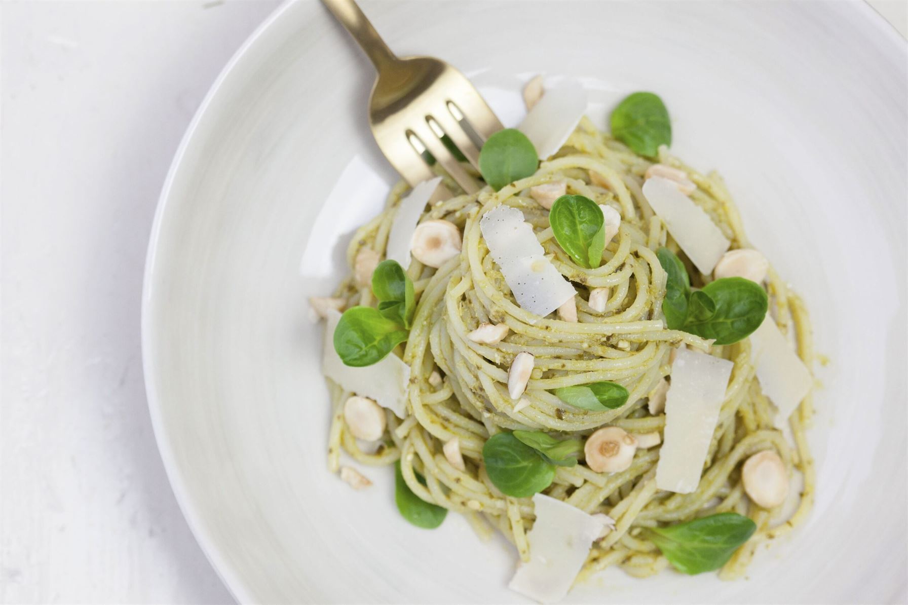 En un plato, servir los spaghetti y decorar con avellanas picadas.