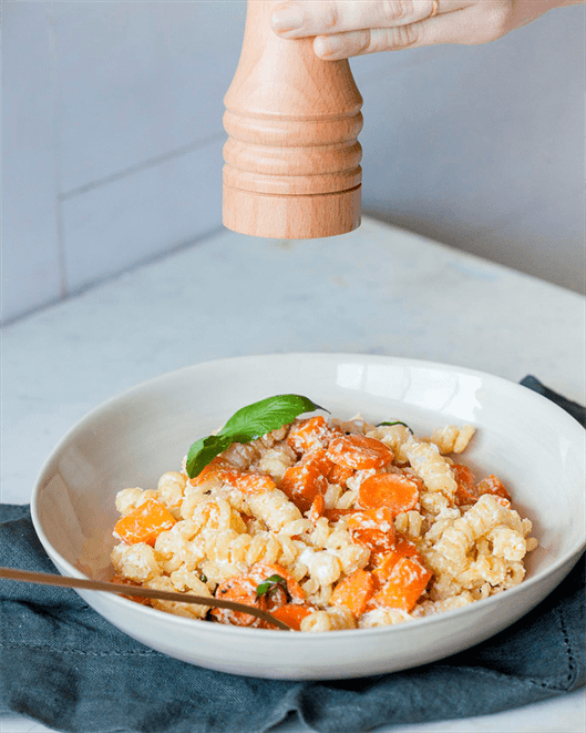En un bol, mezclar la pasta con la ricotta, la zanahoria y la calabaza. Decorar con una hoja de albahaca.